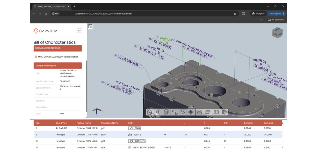 MBDVidia veröffentlicht auf Standards basierende QIF/STEP aus nativen CAD (Creo, CATIA, SOLIDWORKS, Autodesk usw.) und generiert dann eine verknüpfte HTML-Ansicht (und eine PDF-Datei). Das interaktive 3D-Modell und die PMI lassen sich mit jedem Browser öffnen und stellen so für Beschaffung, Fertigung, Qualitätssicherung und Produktion eine einheitliche, verbindliche Ansicht in einem benutzerfreundlichen Format zur Verfügung.