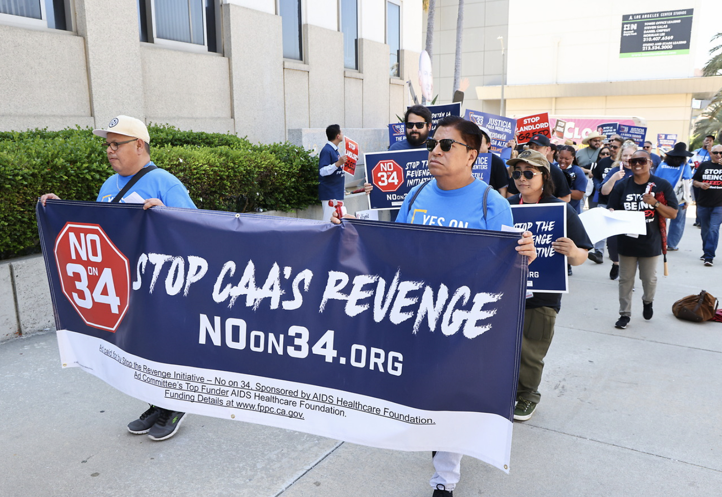 LOS ANGELES–(BUSINESS WIRE)–More than 300 activists, renters, and union members braved the scorching heat to protest the California Apartment Association (CAA) and Proposition 34 outside CAA’s regional headquarters in downtown Los Angeles Thursday. The rally spanned the entire city block and drew attention to the anti-tenant, corporate landlord front group’s attack against AIDS Healthcare Foundation (AHF) over the nonprofit’s ongoing advocacy for rent control.